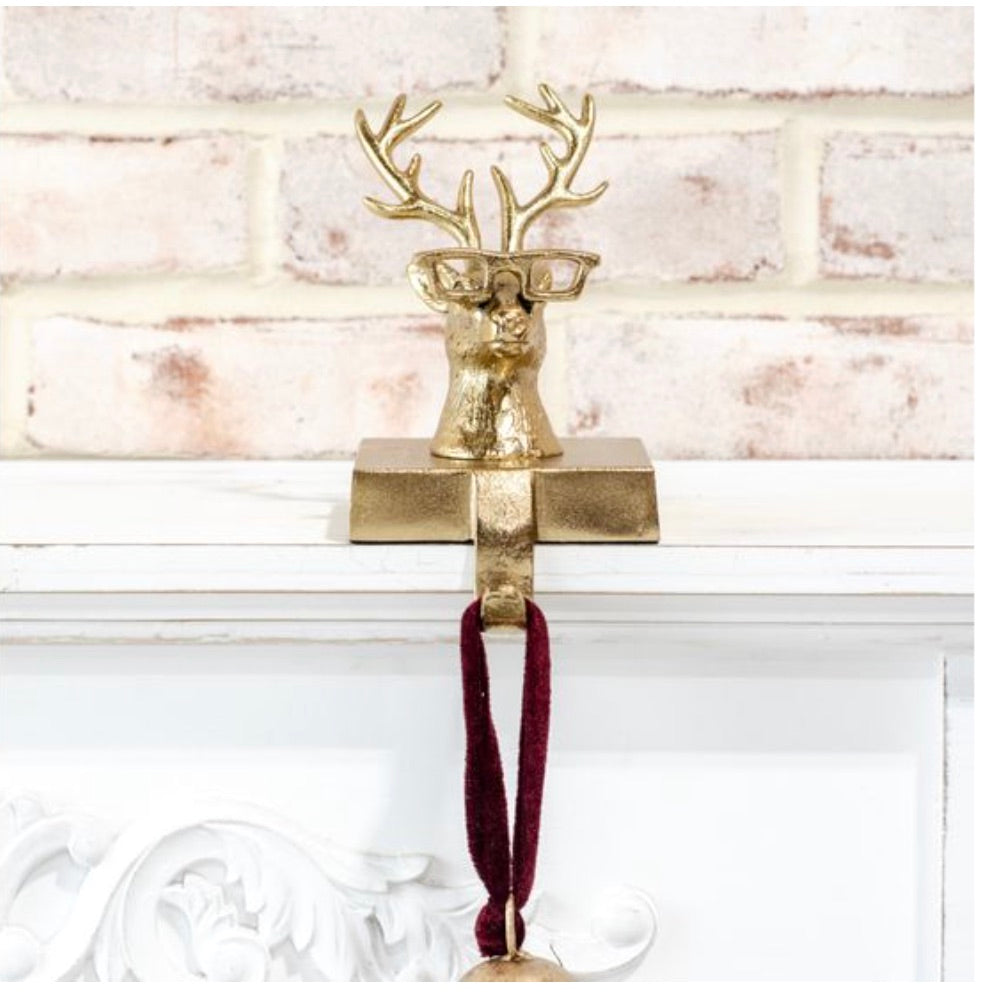 Enhance your holiday display with the Gold Eyeglass Reindeer Stocking Holder. This charming mantel piece pairs festive gold-tone flair with practical stocking display, making it a delightful addition for homes and gifts alike.