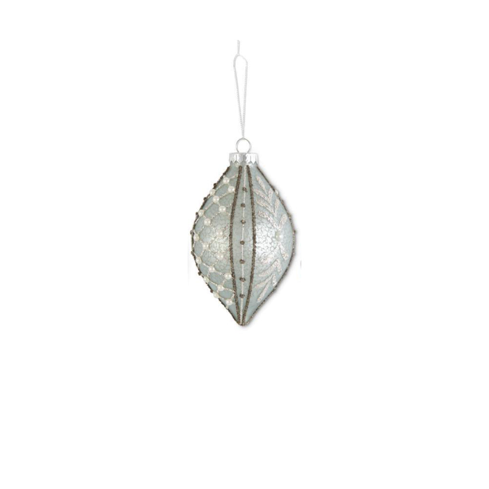 This elegant glittered light blue mercury glass ornament adds a stylish touch to any Christmas tree or home décor. It features a shimmery finish that captures and reflects any light. Perfect for holiday decorating.