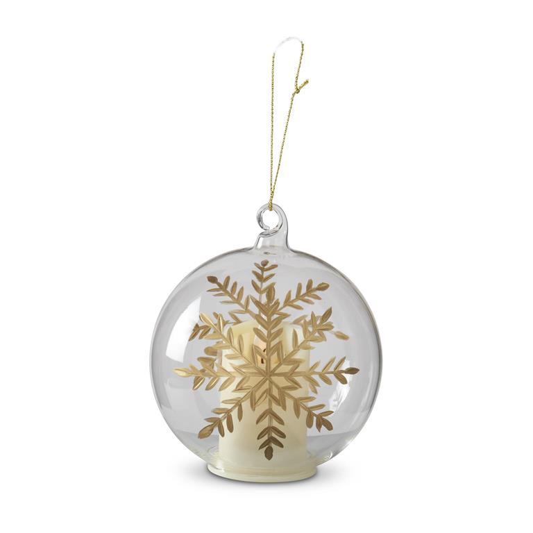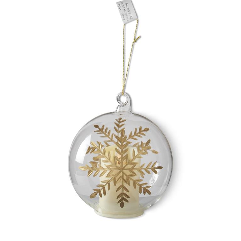 Add a touch of elegance to your holiday décor with this stunning glass ornament, featuring a realistic faux candle inside. The candle's moving flame effect brings a warm and cozy glow to your Christmas tree or festive display. The gold snowflake design on the ornament adds an extra festive touch, making it the perfect addition to your holiday decorations. Hang it anywhere to bring a magical glow to your space.