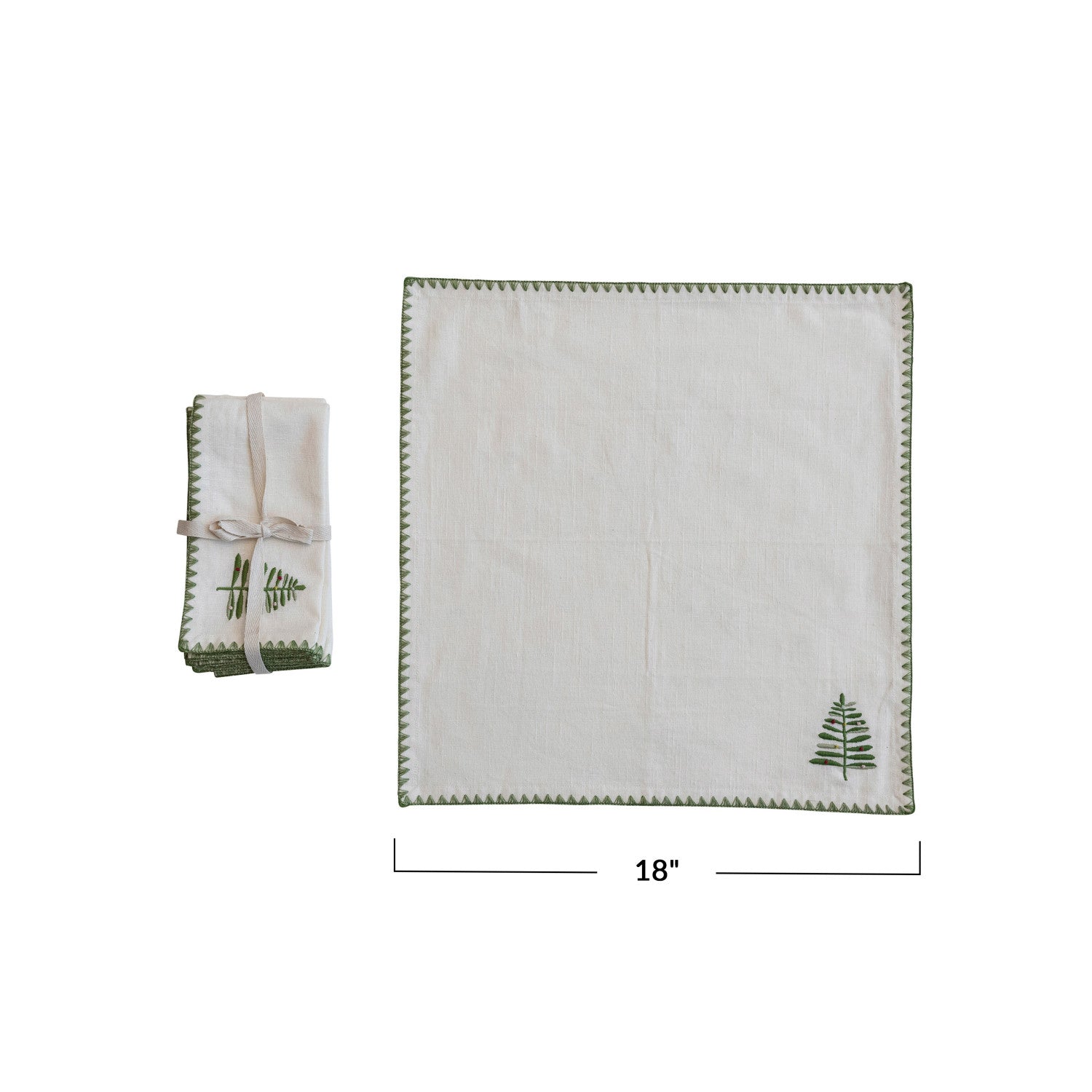 Cotton Napkins w/ Embroidered Tree & Edge, Natural & Green, Set of 4