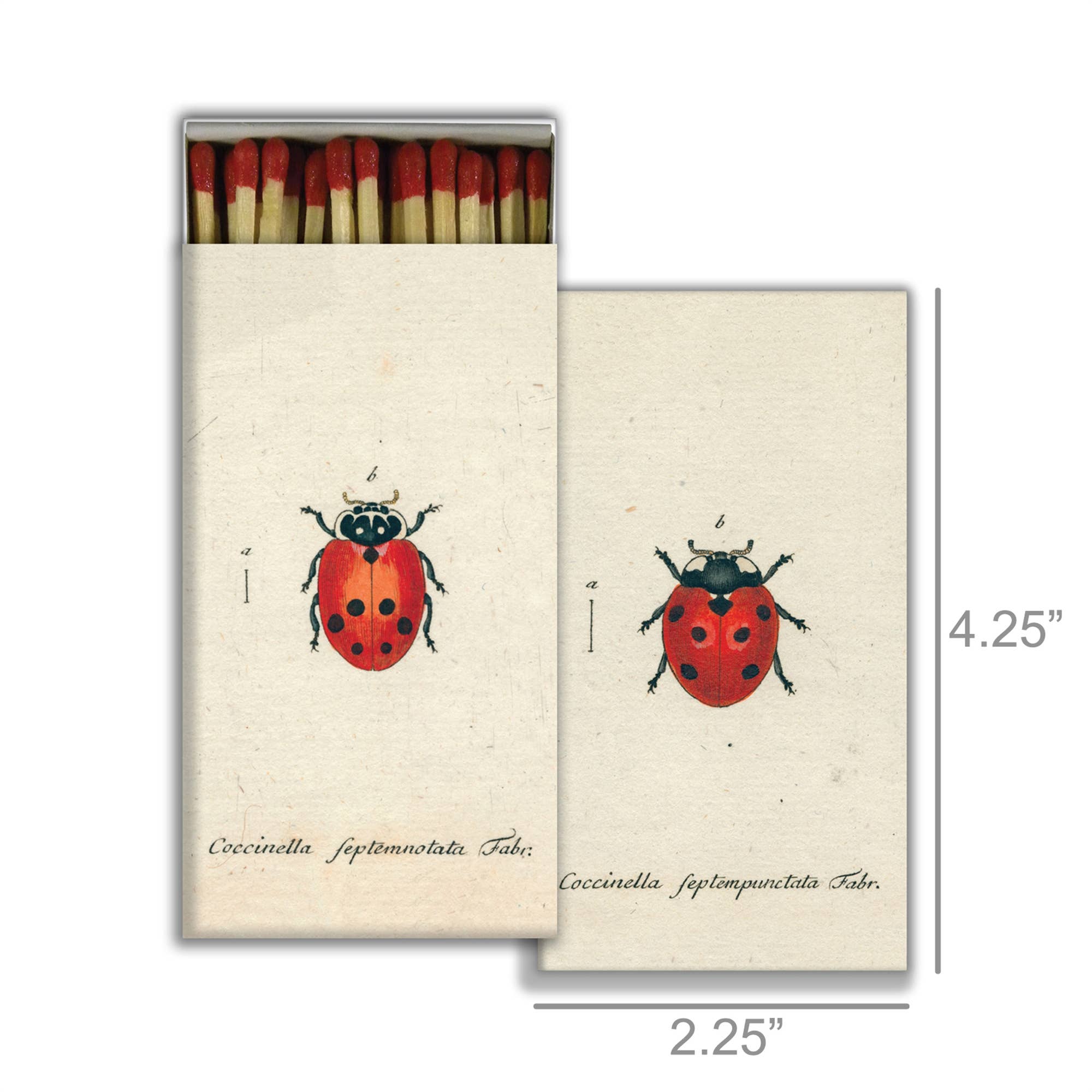 These compact match boxes feature red ladybug motifs that give daily use a light, decorative touch. Each box holds 50 safety matches with coordinated red tips, pairing reliable ignition with a playful design. The glossy red finish and clean illustration suit a candle display, kitchen drawer, or travel kit.