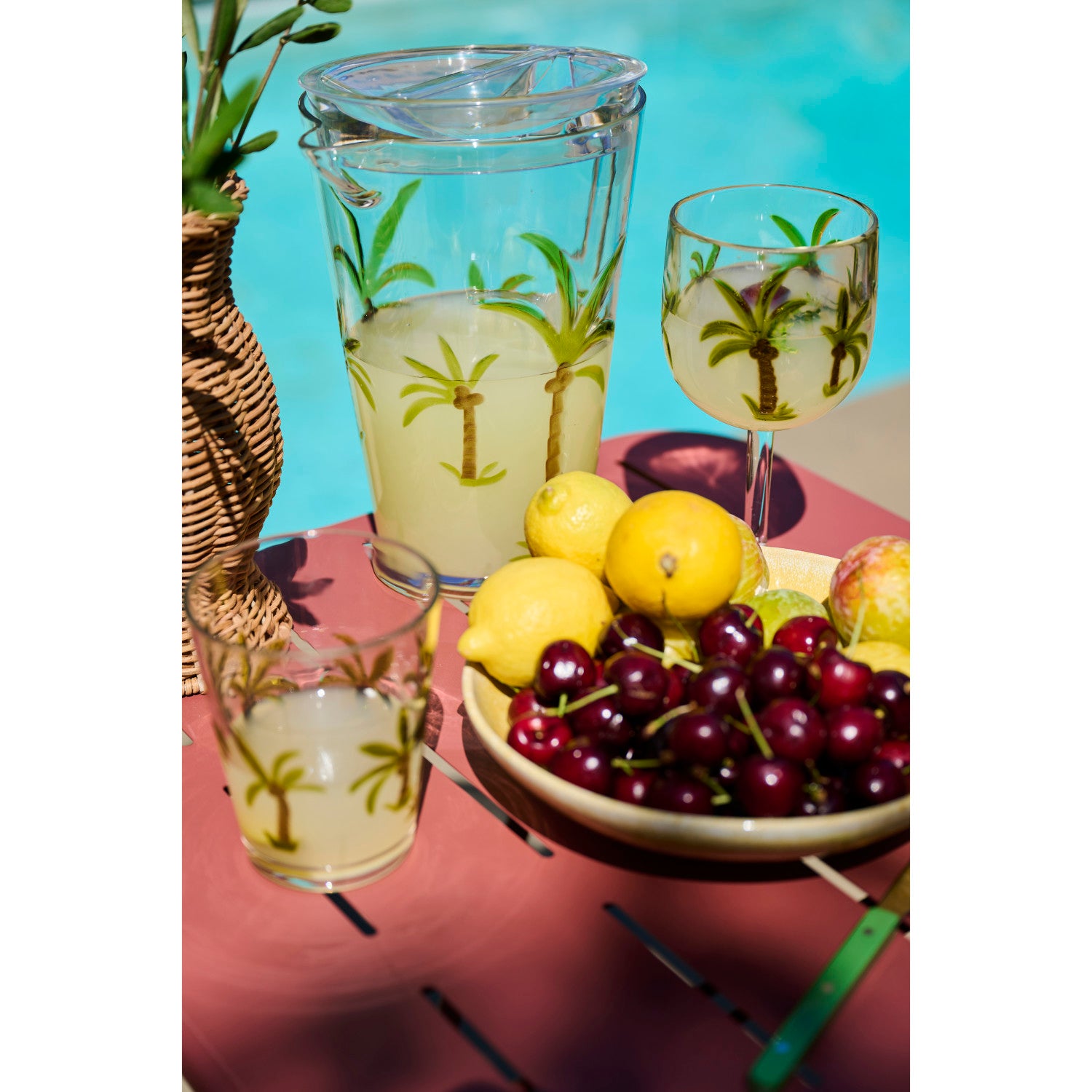 - Design details: Palm-tree motif encircling the pitcher with a practical lid