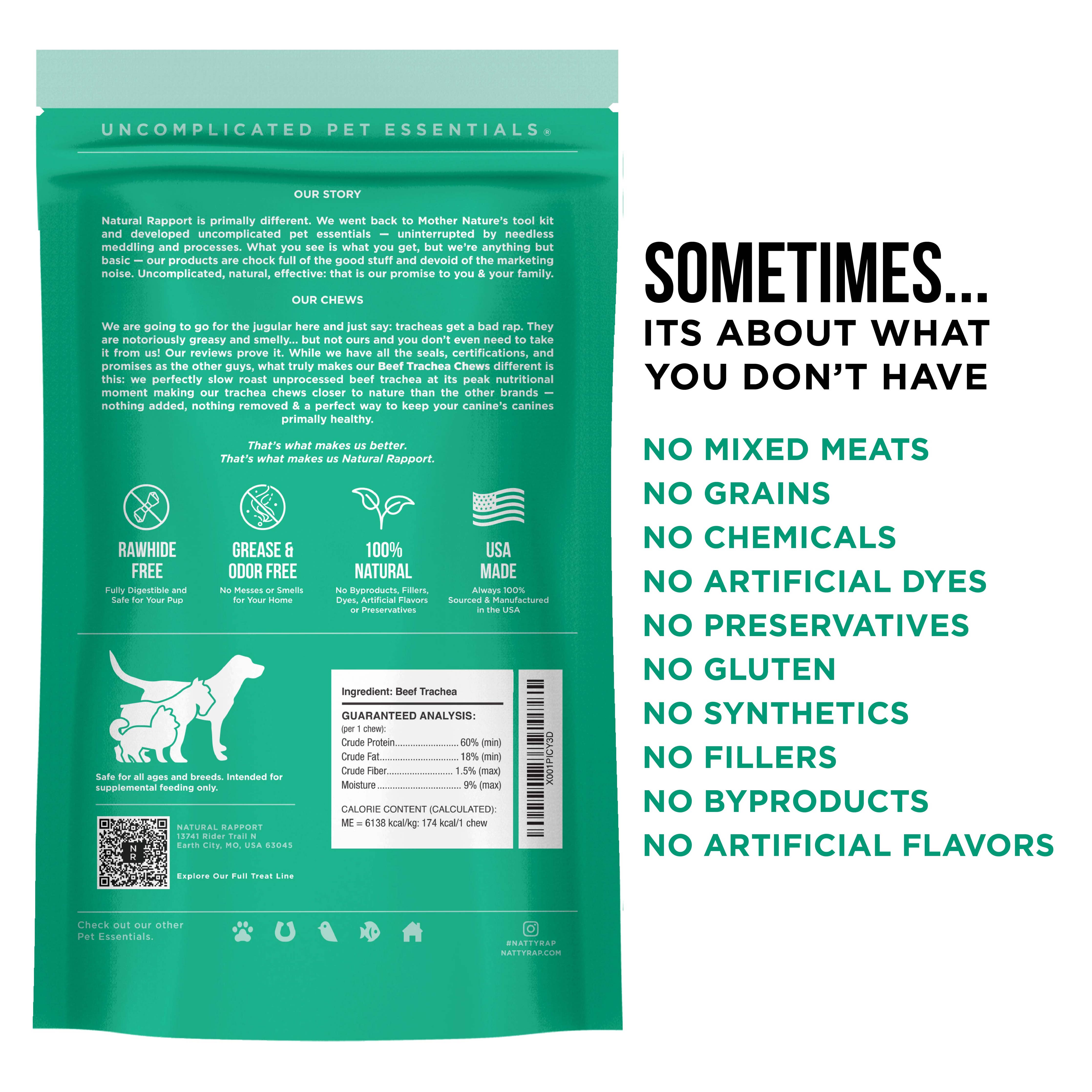 We are going to go for the jugular here and just say: tracheas get a bad rap. They are notoriously greasy and smelly... but not ours and you don’t even need to take it from us! Our reviews prove it. While we have all the seals, certifications, and promises as the other guys, what truly makes our Beef Trachea Chews different is this: we perfectly slow roast unprocessed beef trachea at its peak nutritional moment making our trachea chews closer to nature than the other brands — nothing added, nothing removed & a perfect way to keep your canine’s canines primally healthy.