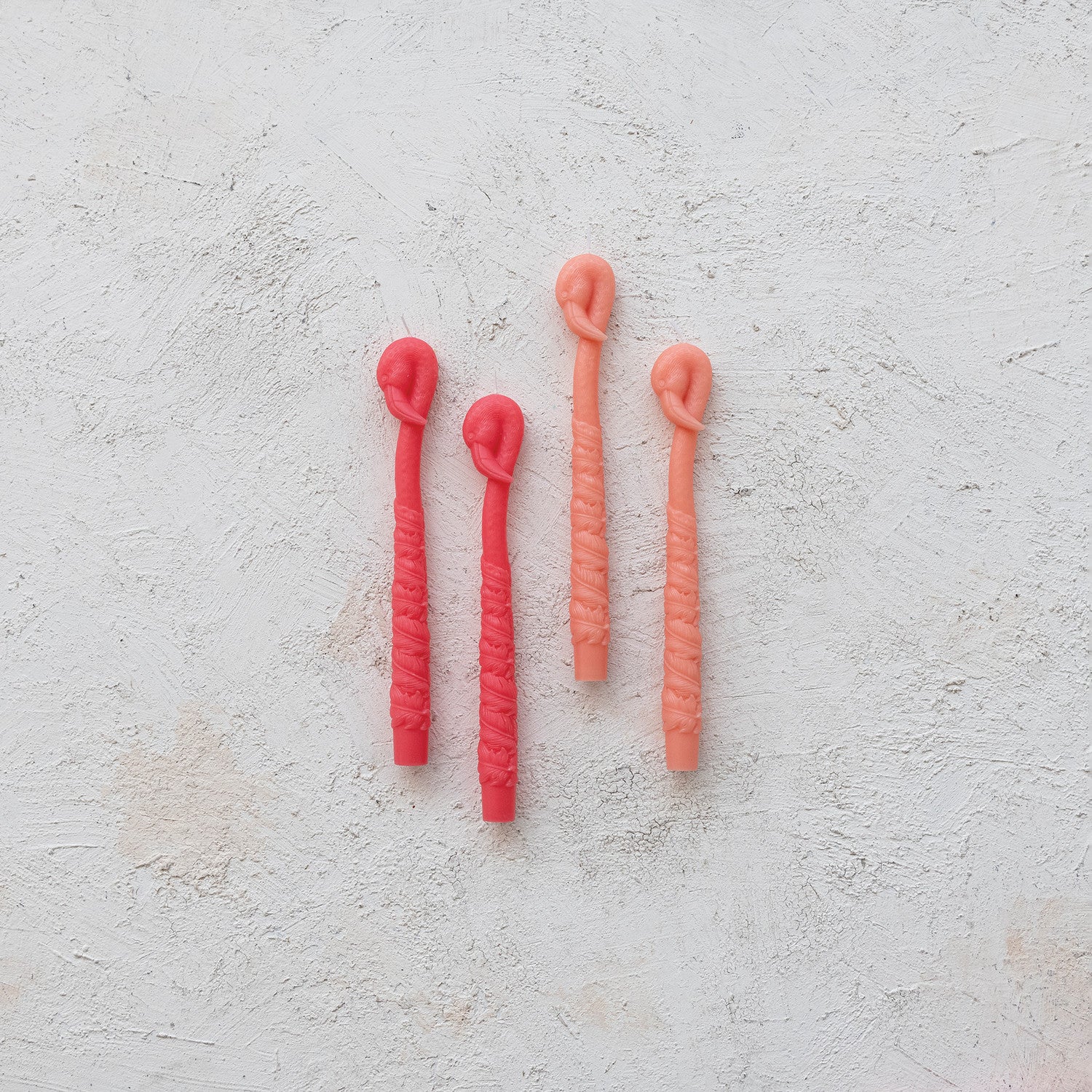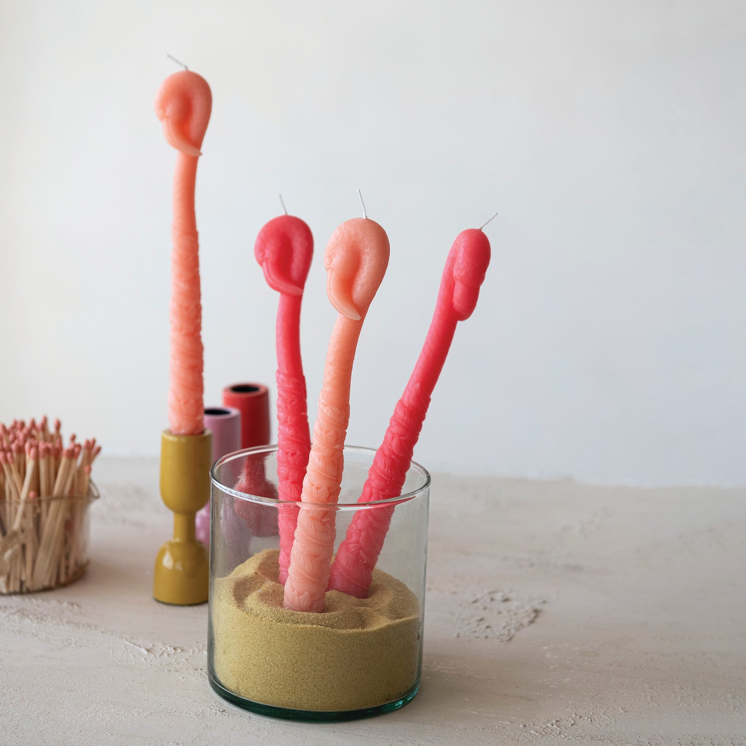 These unscented flamingo-shaped taper candles in a box bring a playful, tropical touch to your space without overpowering a moment. The soft peach color glows with a gentle warmth, and the elegant flamingo silhouette adds a whimsical, yet refined, note to a dining table, coffee table, or entryway vignette.